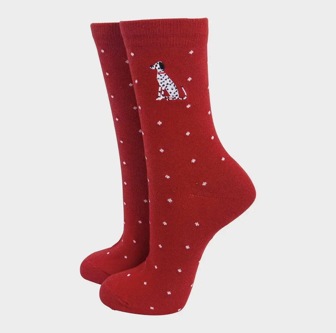 These beautiful socks feature a delicately embroidered Dalmatian and dainty polka dots.